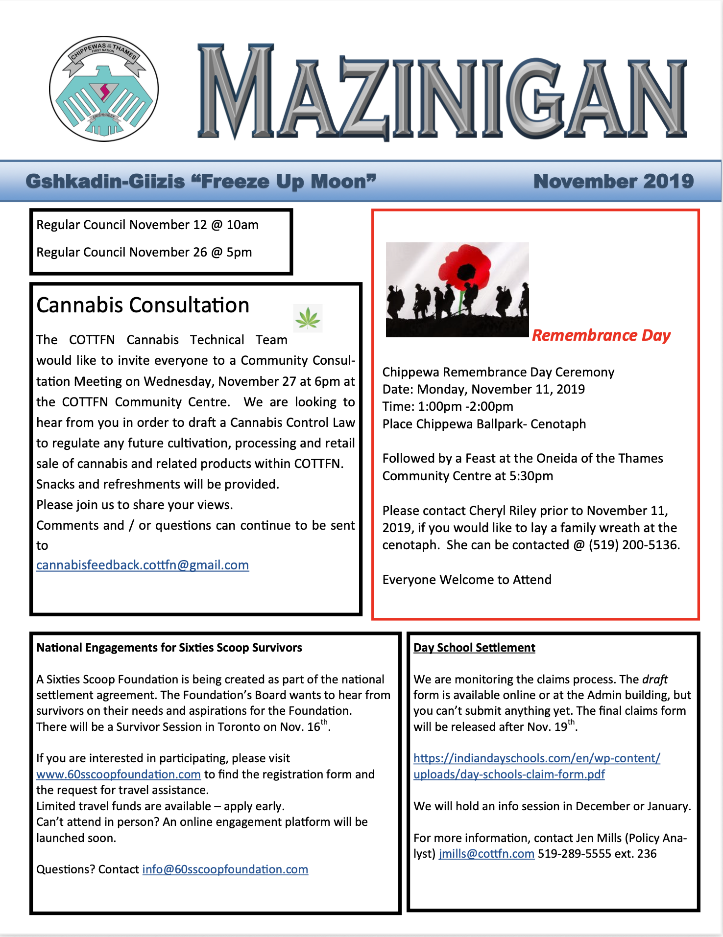 The Mazinigan is Chippewas of the Thames First Nation’s community newsletter, distributed both digitally and in print. When I took over production, the publication lacked a consistent layout, cohesive typography, and organized content flow. To professionalize it and align it with the Nation’s communications standards, I completed a full redesign and template establishment—the first standardized version of the newsletter was published in July 2021.